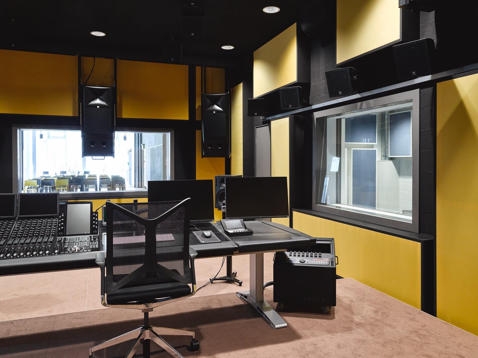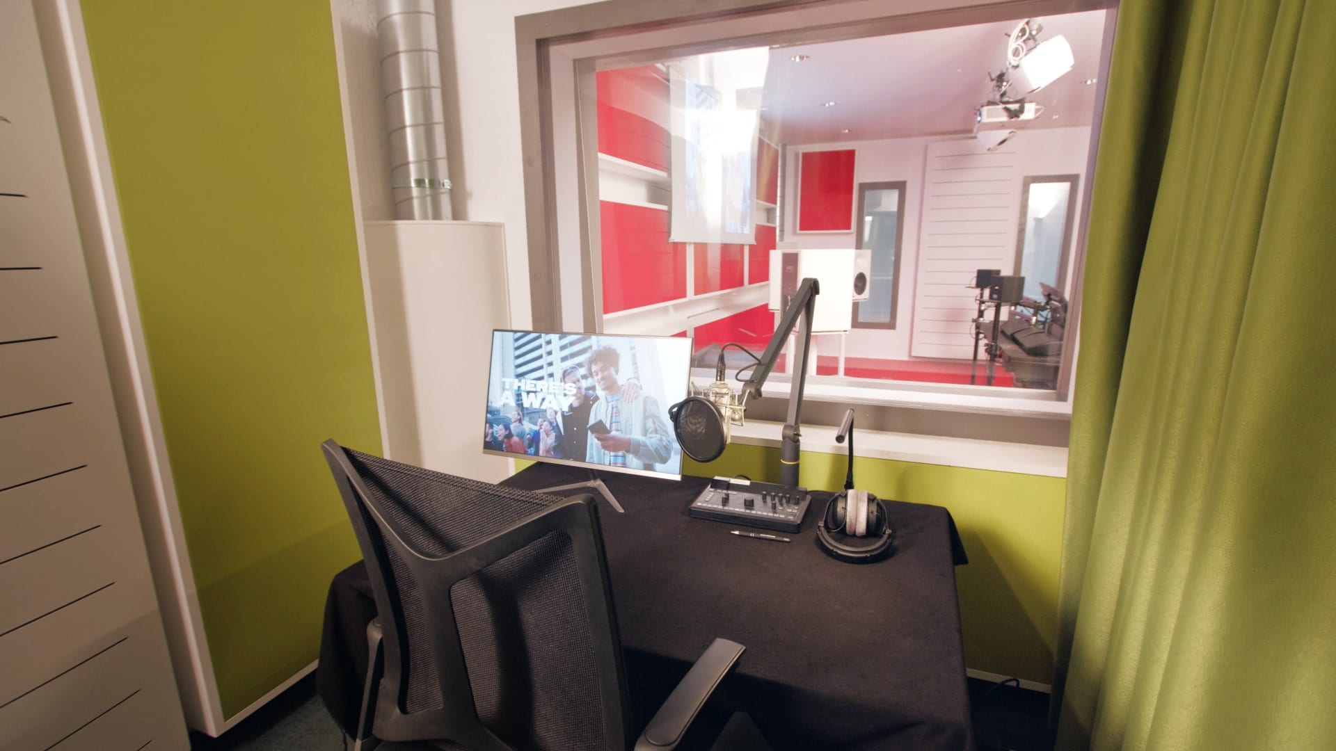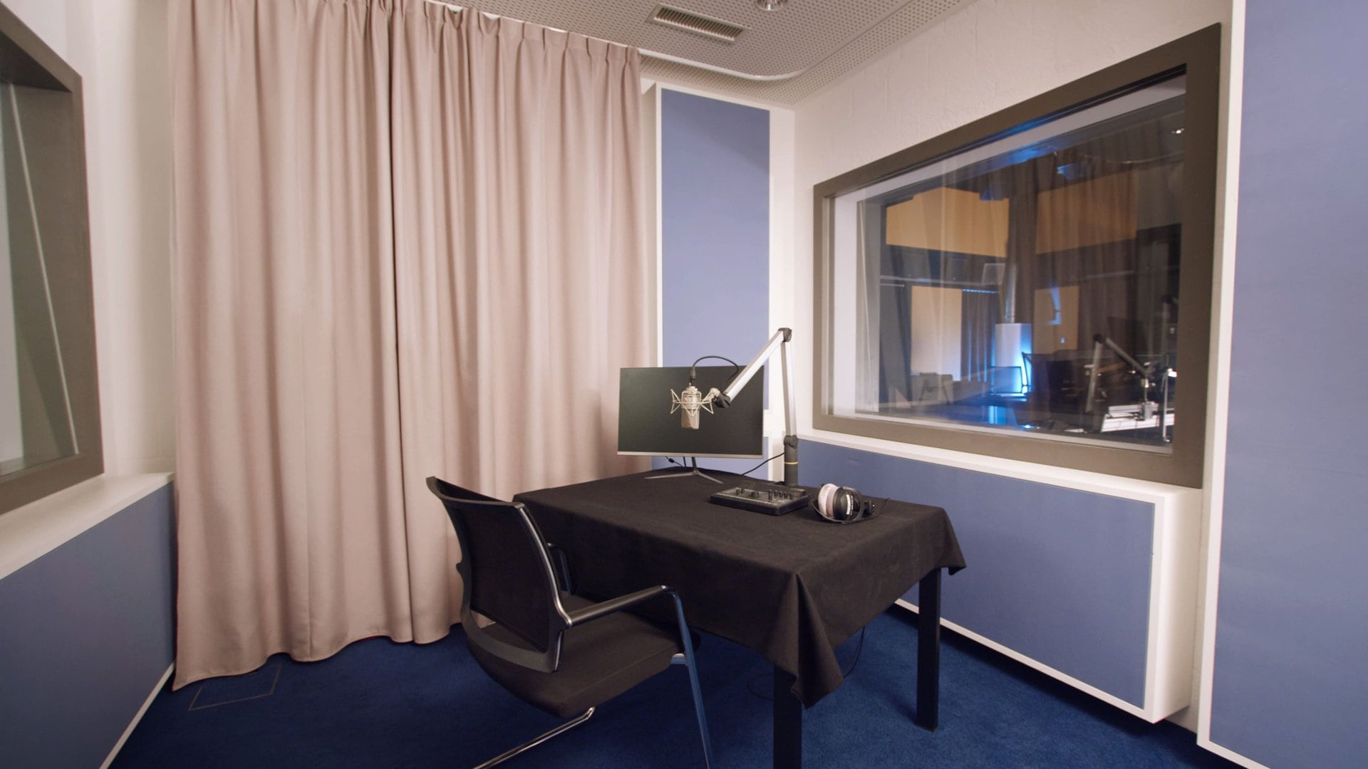 Alle Aufnahmeräume sind akustisch geplant und modular nutzbar. Sie verfügen über Tische und Bildschirme für Ton-zu-Bild-Arbeiten. Modulare Akustik. Offen für mehr Lebendigkeit oder vollständig bedämpft für maximale Trockenheit.