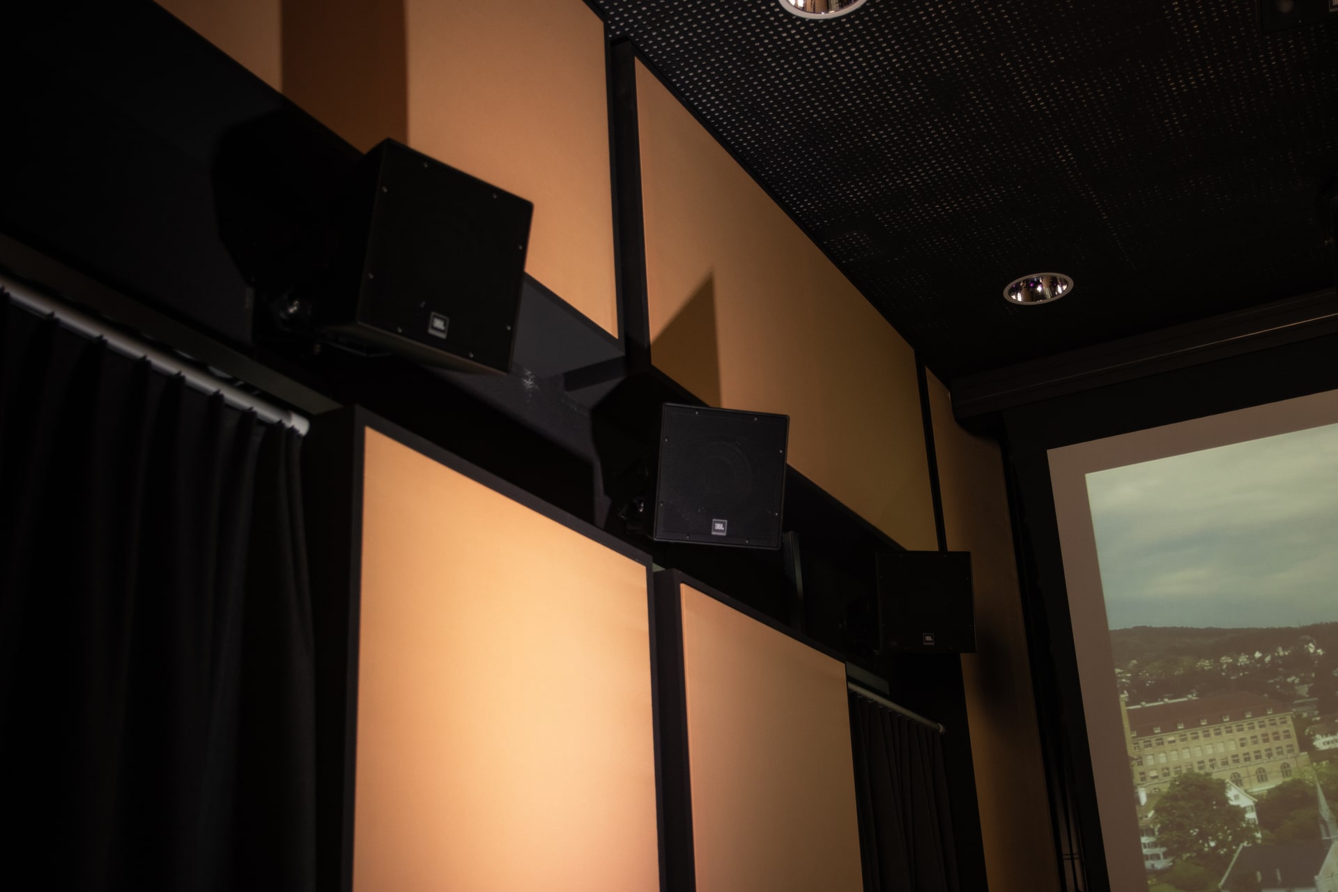 Studio 2 ist auf Dolby Atmos Home ausgelegt. Auch hier war Dolby vor Ort. Die Home-Zertifizierung wird offiziell nicht mehr vergeben, die Planung und Abnahme erfolgte dennoch nach Dolby-Vorgaben. Ein präziser Raum für Mehrkanalproduktionen, Musik und moderne Medienformate.